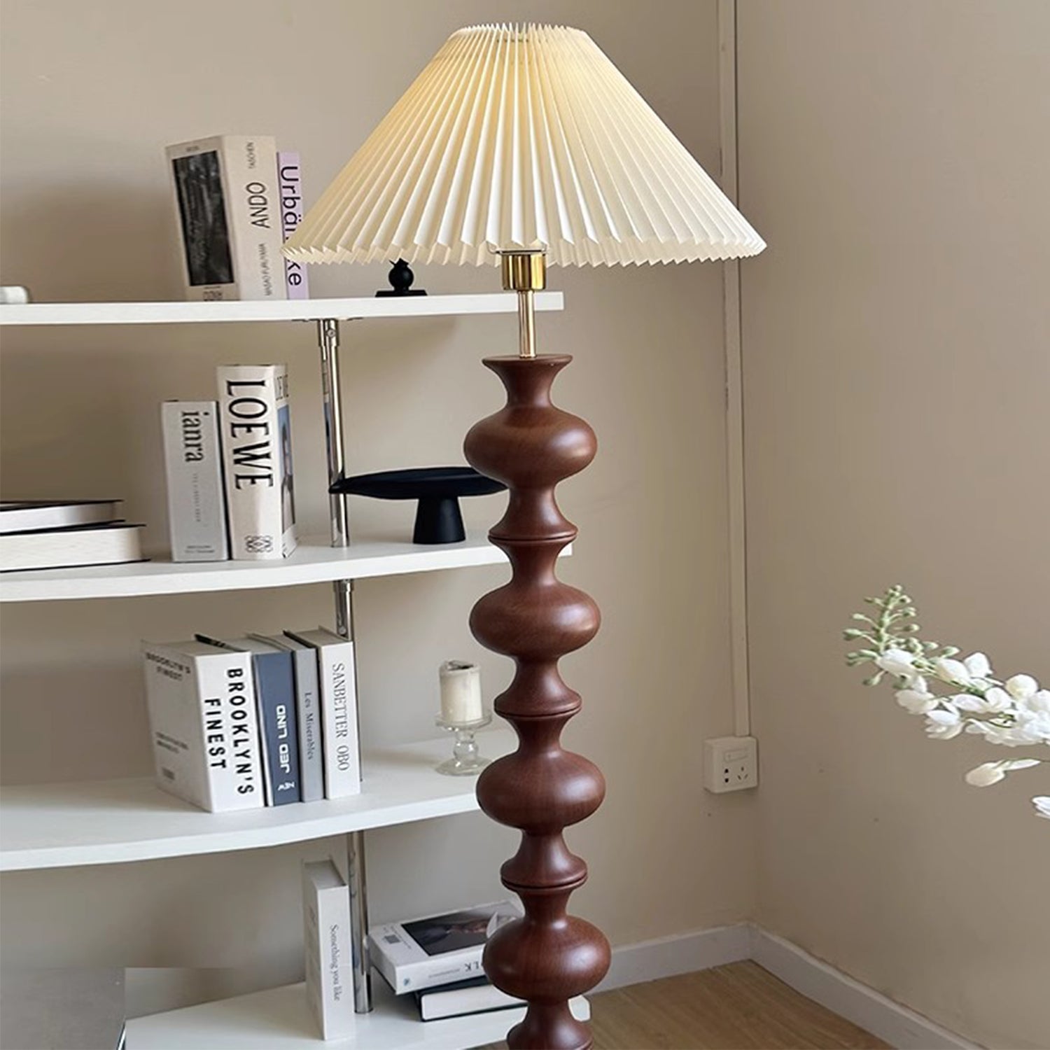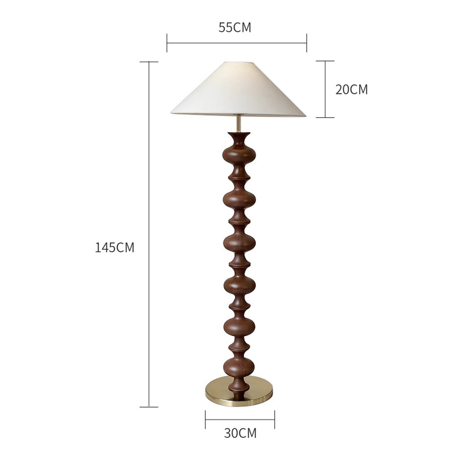 A mid-century modern design featuring a fabric lampshade gracefully extending down to a vintage wooden stand, our POLO standing lamp illuminates your surroundings with a touch of whimsy and elegance. Unveil an old world charm with its intricately carved stand —a true conversation piece in any modern, victorian, or eclectic living room or bedroom.
