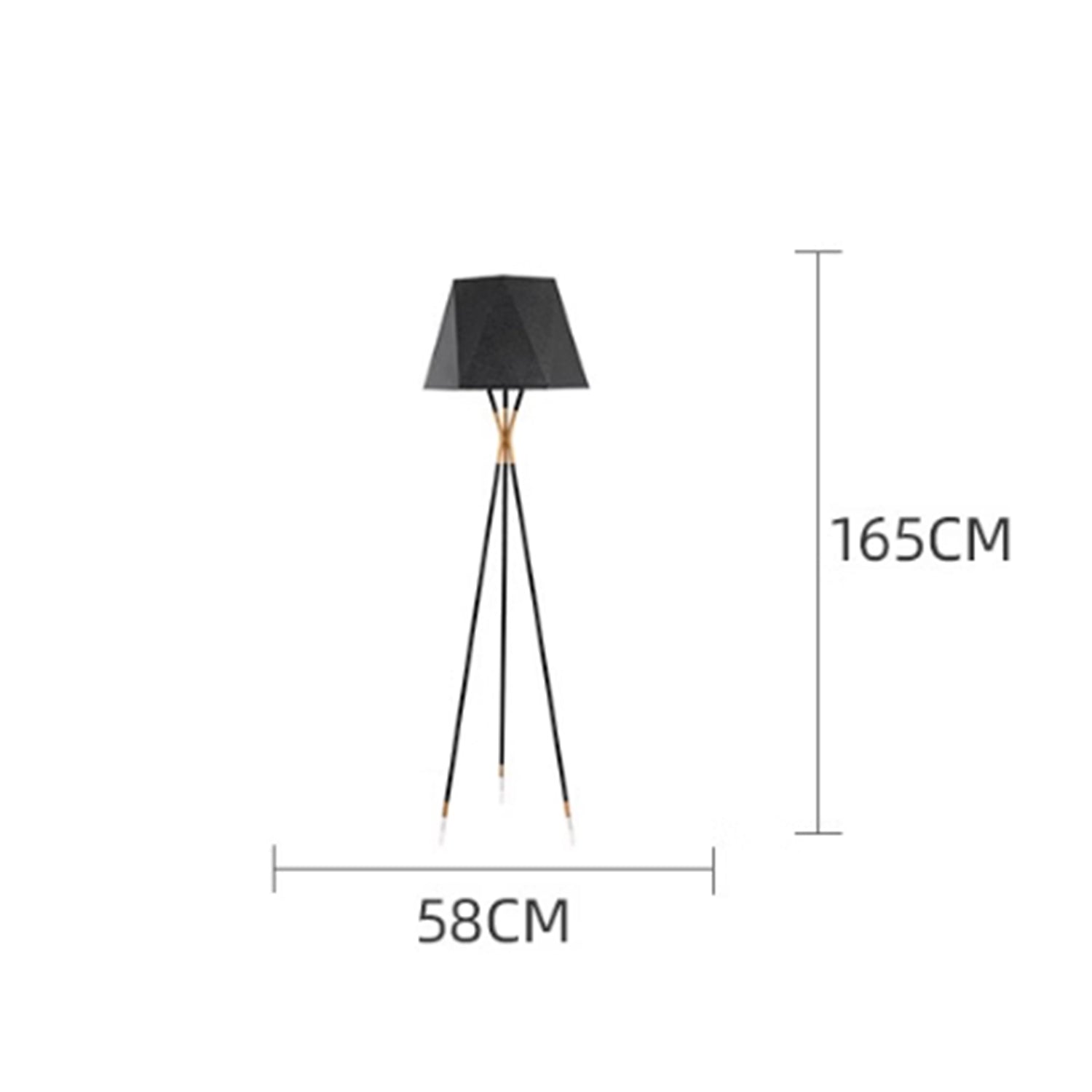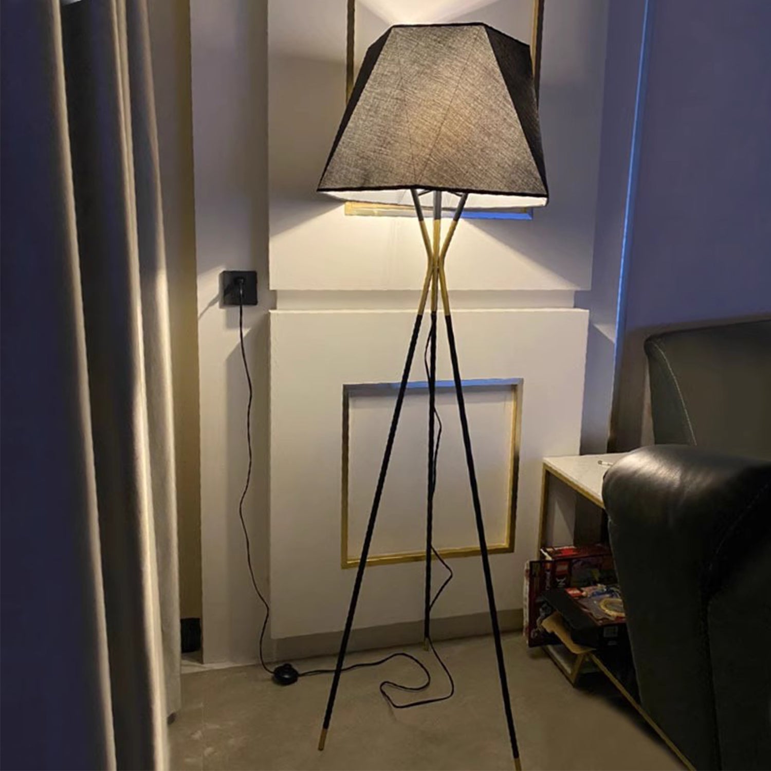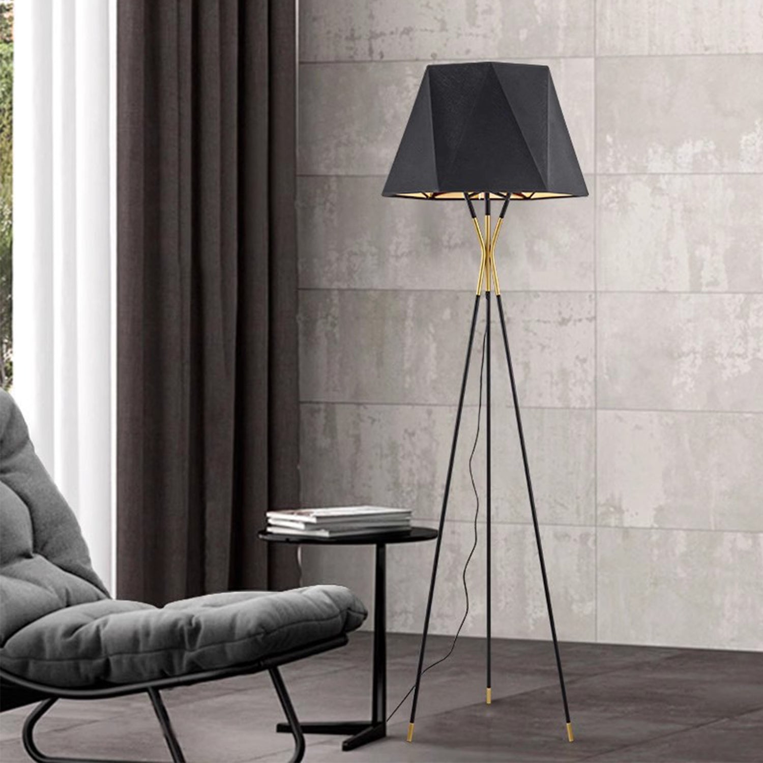 Современный роскошный торшер Stanley на треноге. Этот светильник отличается стильным сочетанием загадочной чёрно-золотой отделки, ножек-треногов и многоугольного абажура, что подчёркивает атмосферу современной роскоши, царящую в помещениях, где он был представлен.