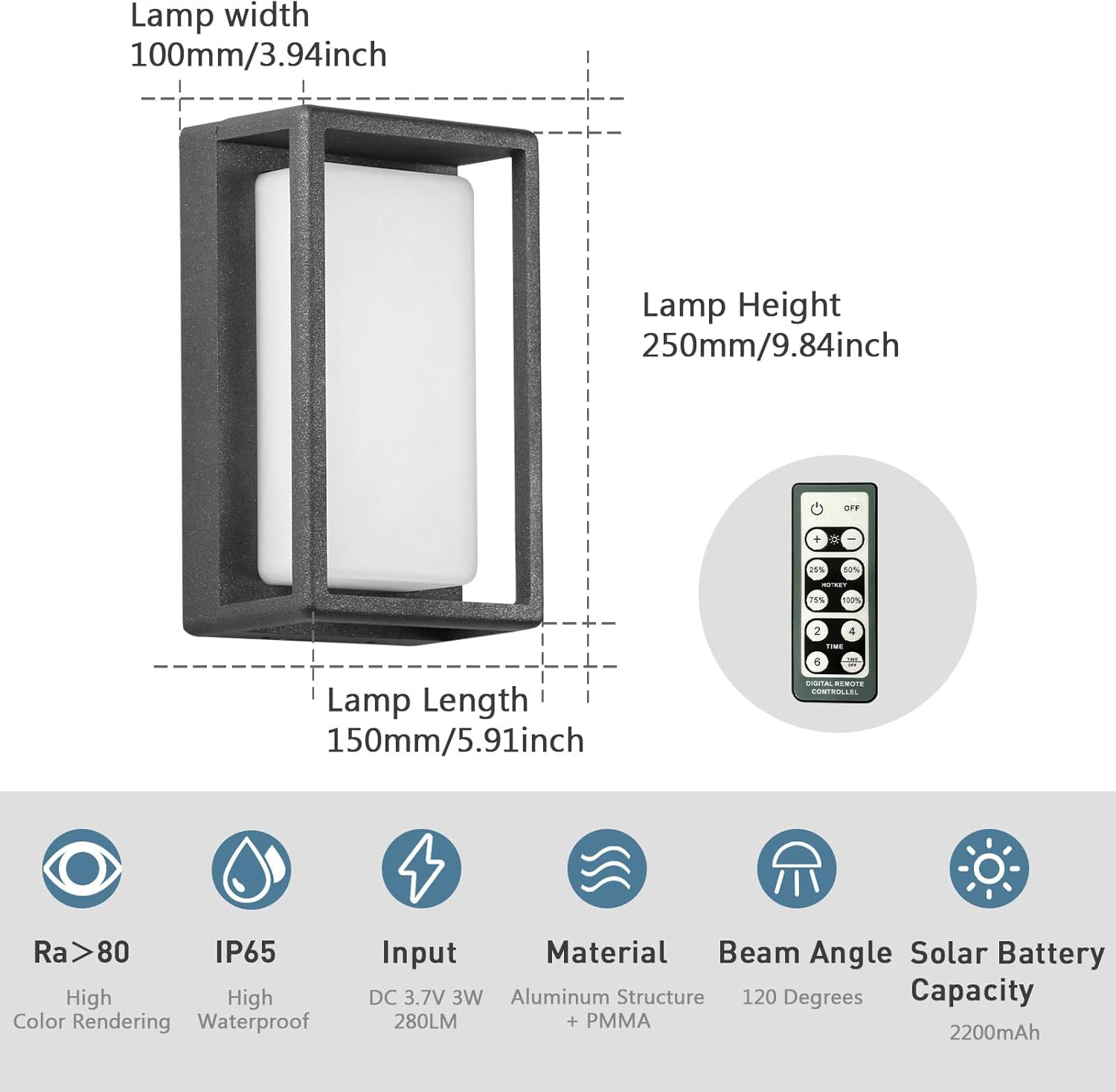 Солнечный настенный светильник : Этот настенный светильник, работающий исключительно на солнечной энергии, экономичен и экономичен, избавляя от лишних счетов за электроэнергию. Зарядка в течение 5–7 часов обеспечивает 8–10 часов освещения, что делает его умным и экологичным дополнением к вашему дому.